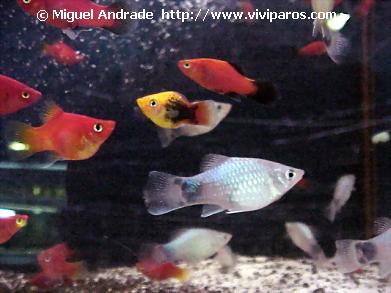 Grupo de Xiphophorus maculatus de uma variedade doméstica fruto de selecção artificial. Imagem captada e publicada por cortesia da loja Aquaplante, Lda a quem muito fico grato.